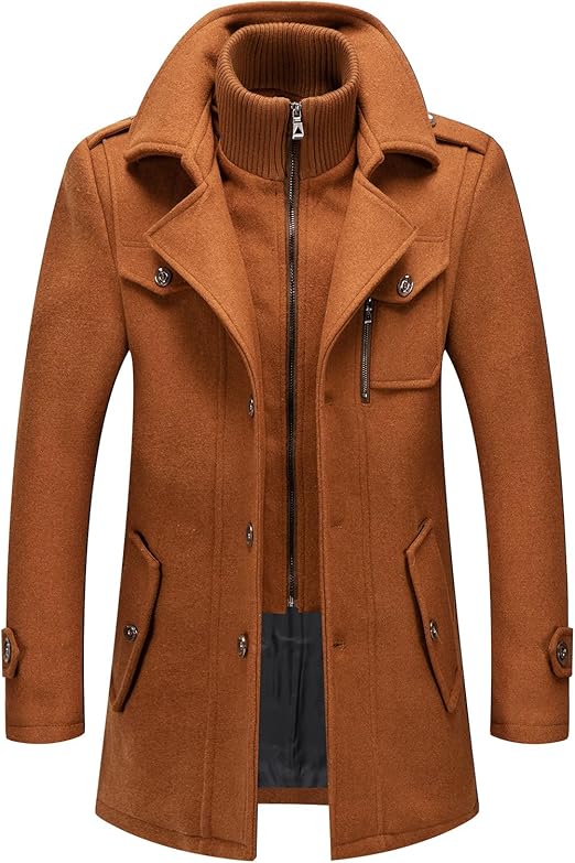 Men's Wool Blend Coat Warm Winter Trench Coat with Detachable Soft Scarf Single Breasted Pea Coat