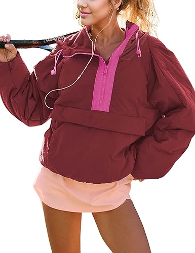 Womens Crew Neck Pullover Puffer Long Sleeve Loose Jacket Half Zip Hooded Coat with Drawstring