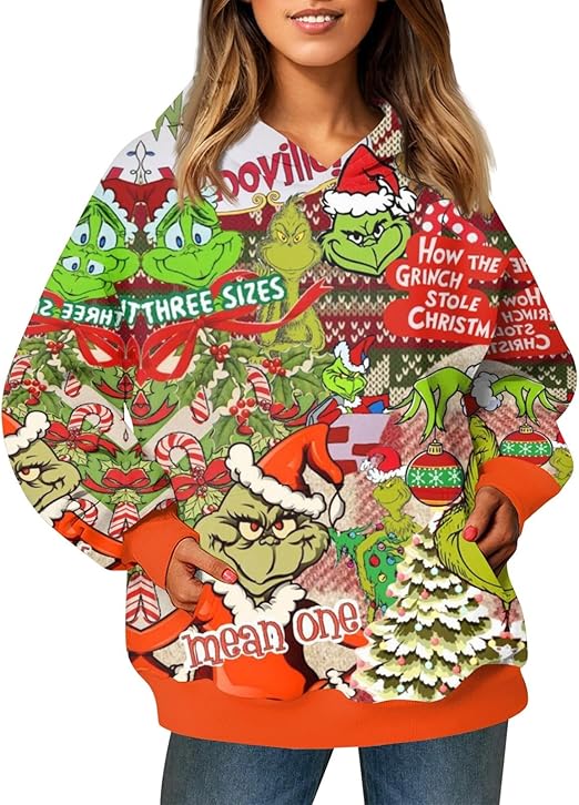 2024 Christmas Hoodie for Women Green Monster Y2K OverSized Long Sleeve Hoilday Casual Sweatshirt