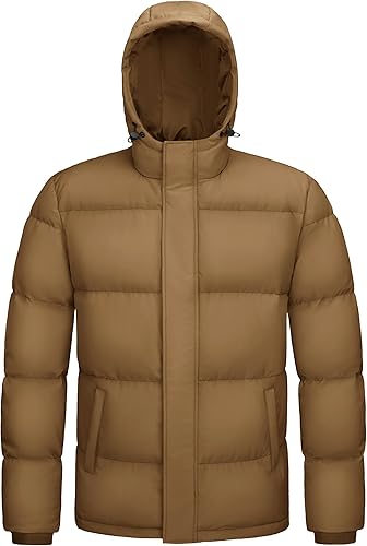 Mens Hooded Down Jacket Water Resistant Puffer Jacket Full Zip Up Windproof Winter Jacket with Zip Pockets